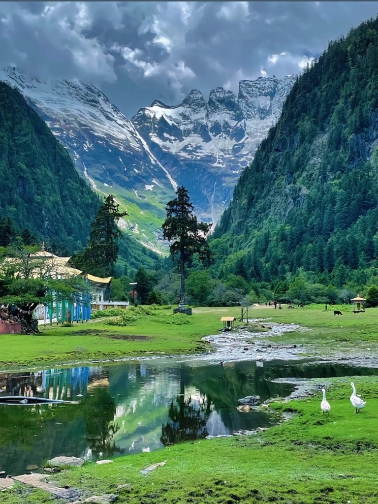 香格里拉,被雪峰守护着,森林、湖泊相互环绕,草甸上牛羊悠然吃草,天空清澈得没有一丝杂质。