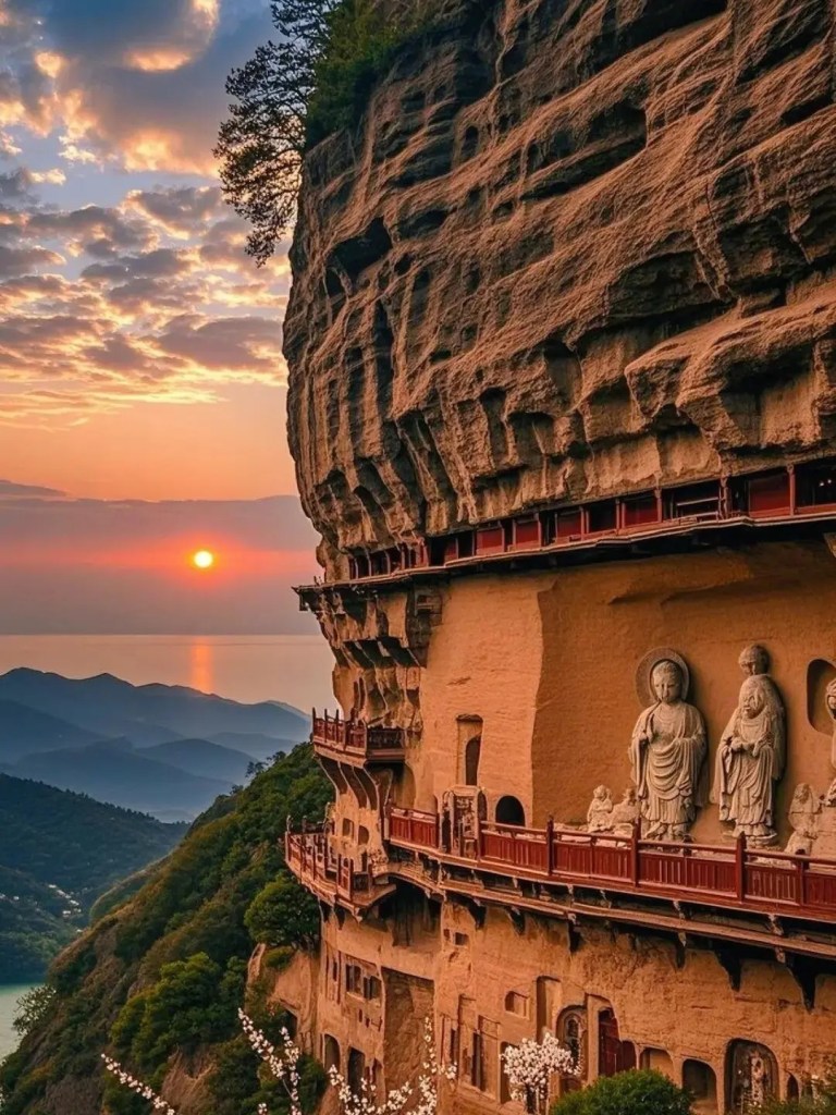 始凿于公元4世纪,以细腻生动的雕塑艺术著称。洞窟依悬崖而建,221个石窟如蜂巢般镶嵌在峭壁之上,佛像神态温润,是研究中国古代雕塑与佛教艺术的重要宝库。