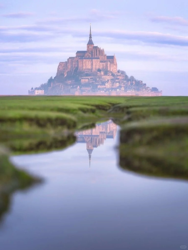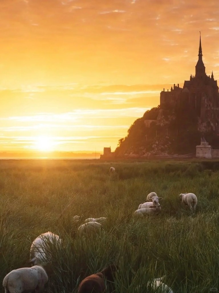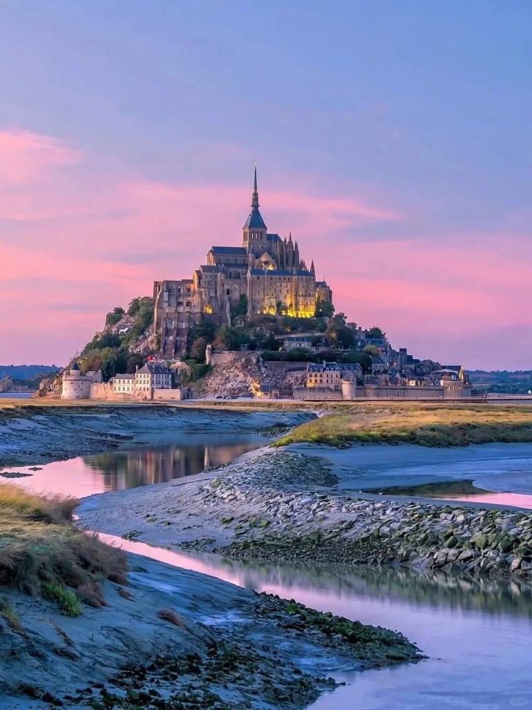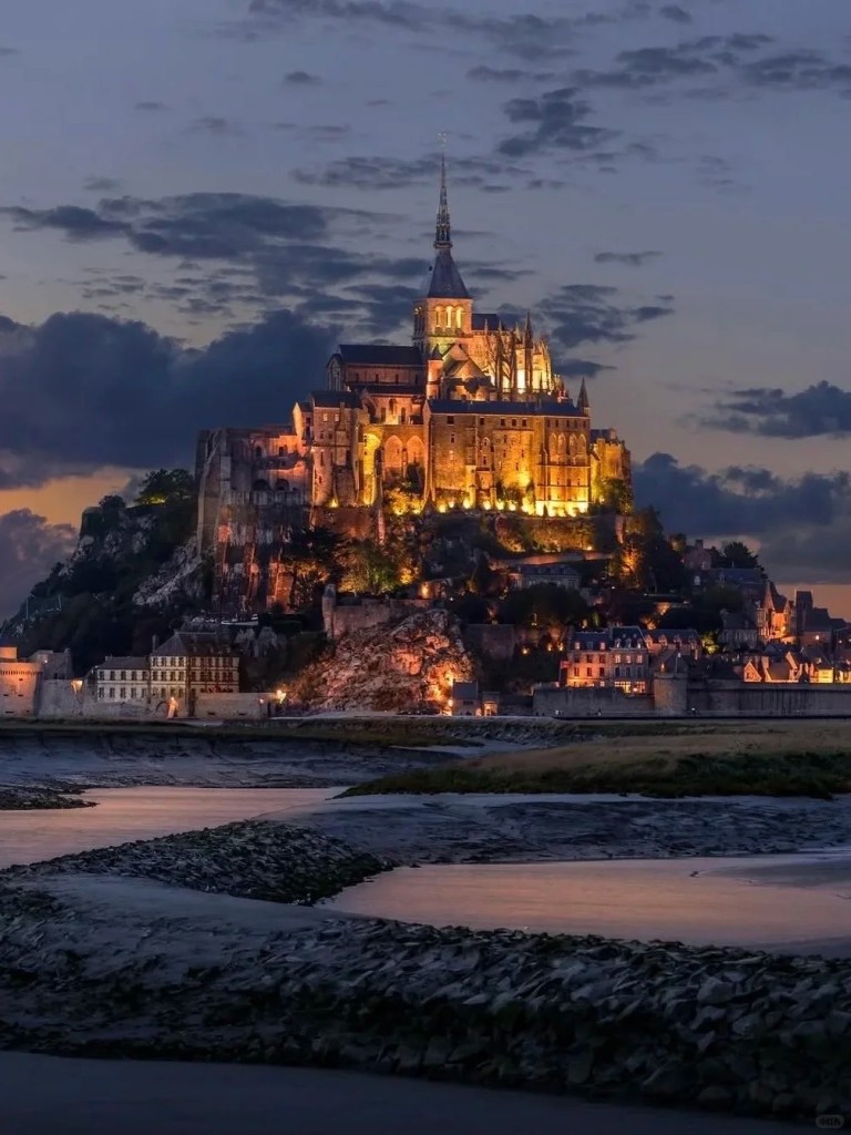 圣米歇尔山被称作“海上仙山”,始建于公元8世纪,核心为罗曼式与哥特式融合的修道院。岛上常住人口约30人,仅靠一条堤坝与大陆相连。这里以涨落潮汐差异大而闻名——涨潮时宛如孤岛,退潮后显露滩涂,美得如同童话世界。