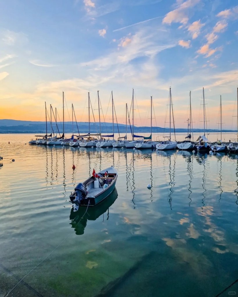彩色小船 + 对岸雪山,傍晚尤其浪漫